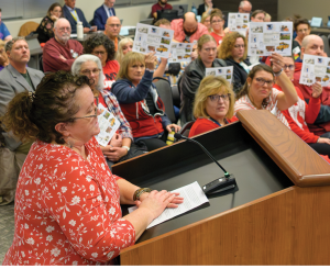 On November 19, members of the Frederick Association of School Support Employees (FASSE) filled a section of the county’s board of education meeting room with red t-shirts and blown up versions of the 450 postcards they hand delivered to the board members. FASSE is asking the board for the third time to endorse the ESP Bill of Rights and demanding that they prioritize and plan for a living wage for all support staff.