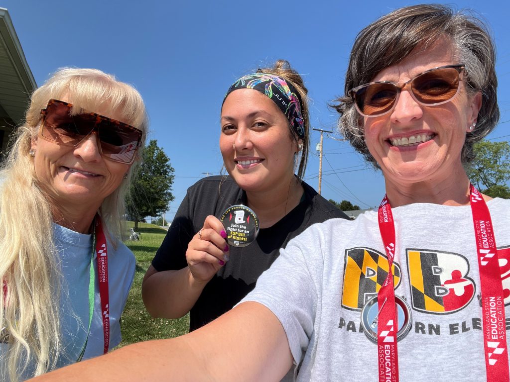 Kathy, with fellow WCESP organizers Ashley Godles, Amy Kerarise, Jaqueline Shupe, Rhonda Ramsey, and coach Stacey Albrecht (Harford County) of the Western Maryland campaign, are among 33 member organizers, including three experienced coaches, who canvassed door to door in sweltering heat. In all, these new and veteran union organizers knocked on more than 9,000 doors in targeted support staff locals using the ESP Bill of Rights to define 10 issues of wages, safety, job security, union rights, and more to engage members to fight for better contracts for ESPs in every job category.