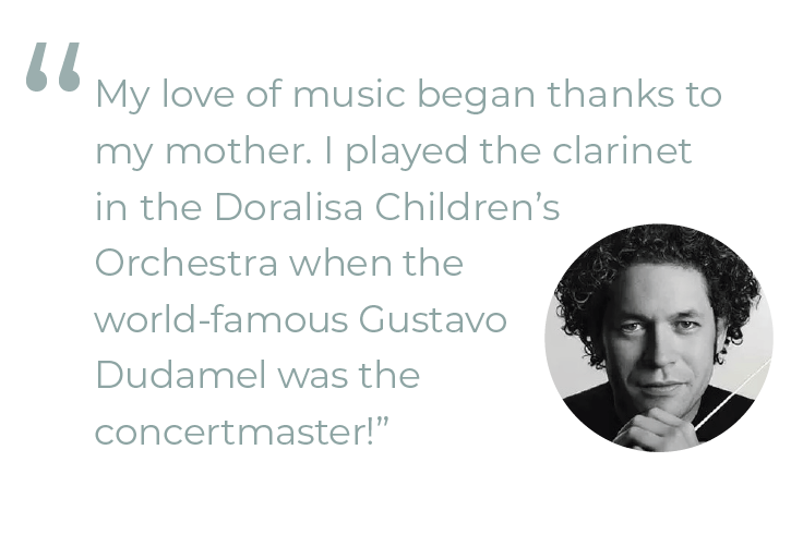 My love of music began thanks to my mother. I played the clarinet in the Doralisa Children’s Orchestra when the now world-famous Gustavo Dudamel was the concertmaster! Later, I graduated with a degree in music education at the University Institute of Musical Studies, in the city of Caracas, and began studies in opera singing, which I chose not to complete due to political changes imposed on the academic curriculum.