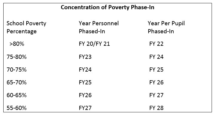 In addition to funding community school coordinators and health practitioners at community schools, the Blueprint designates per pupil funding in the amount of $3,374.48 (to be adjusted annually for inflation) to go to schools with between 55% and 80% concentration of poverty and applied on a sliding scale of the full per pupil amount for schools with 80% FARMs rate and less per pupil for schools down the scale.