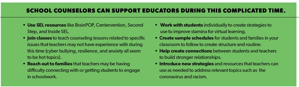 This aspect of social isolation is perhaps the most concerning impact of the coronavirus on students. Many students aren’t able to play or socialize with peers in any capacity and that’s a critical aspect of cognitive development for young students. Many of our students will likely take steps back in their ability to form friendships and regulate emotions. We can also expect their behaviors to worsen due to lack of structured play and routine. The role of school counselors will be more important than ever as we address these gaps in the upcoming year whether virtually or in person.